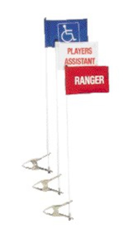 Mit den neuen Golfwagen-Identifikationsfahnen können z.B. die Golfwagen behinderter Spieler leicht erkannt oder Ihr Personal auf dem Golfplatz sofort wahrgenommen werden. Die Druckschelle kann am Dach oder an der Karosserie des Golfwagen angebracht werden. Die weiße Fahnestange ( 71 cm ) läßt sich schnell und einfach ein-und ausschrauben. Gut sichtbare Fahnen ( 14 x 20 cm ) im Siebdruck mit dem Aufdruck PLAYERS ASSISTANT, RANGER oder mit dem Rollstuhl-Symbol