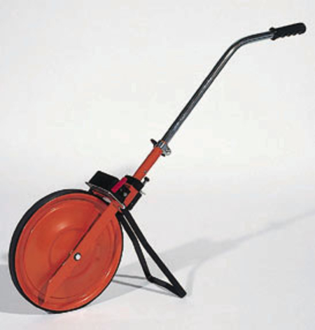 Das Präzisionsmeßrad ist ein hochwertiger Rolltacho mit Einarmgabel. Er hat ein Scheibenrad aus Kunststoffvollmaterial und einen Radumfang von einem Meter. Das Zählwerk zählt auch rückwärts ist stoßsicher und liegt genau im Blickfeld. Die Meßgenauigkeit liegt unter 0,02 %, der Meßbereich geht bis 9.999 m. Die Führungsstange ist aus verzinktem Stahlrohr mit einem handlichen Griff. Das Meßrad ist zusammenklappbar und so in einem Koffer zu transportieren. Der Koffer gehört nicht zum Lieferumfang.