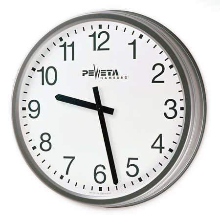 als DCF77 Funkuhr, einseitig, unbeleuchtet, Gehäusedurchmesser ca. 540 mm, witterungsbeständiges Metallgehäuse aus Aluminium, Gehäusefarbe anthrazit-graumetallic (Farbnummer DB 703), für Wandmontage. Sehr deutliches, auch aus größeren Entfernungen zweifelsfrei ablesbares Metallzifferblatt, weiß lackiert mit schwarzen Zahlen, Schwarze DIN-Balkenzeiger für Stunden- und Minutenanzeige. Frontglas aus unzerbrechlichem Makrolon® (Polycarbonat). Automatische Zeitsynchronisation bei Inbetriebnahme und vollautomatische Sommer-/Winterzeitumstellung. Betriebsspannung Batteriebetrieb 2 x 1,5 V (mittlere Laufzeit ca. 4 Jahre)