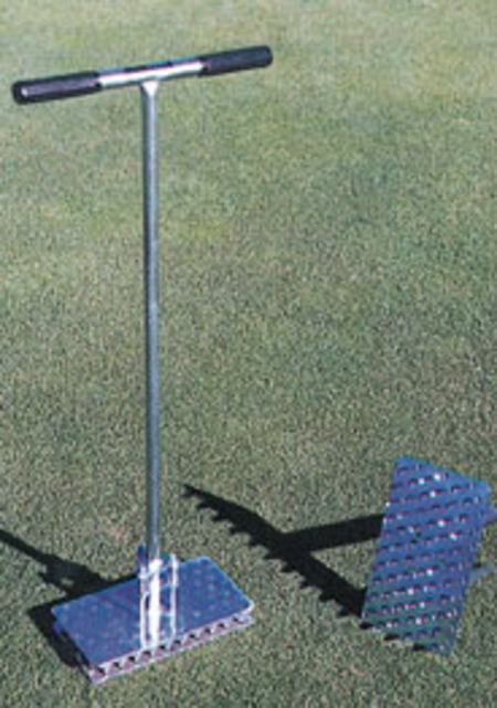 das ideale Handnachsägerät, auf einer Grundfläche von 8" x 11" ( 20,3 x 27,9 cm ) sind 72 Zinken mit einen Durchmesser von 0,6 cm und eine Tiefe von 1,2 cm bis 1,9 cm. Dadurch gibt es kaum Einfluß auf das Rollverhalten des Balles. Mit dem Spot over Seeder können Sie erstaunliche Flächen in kürzester Zeit nachsäen.
